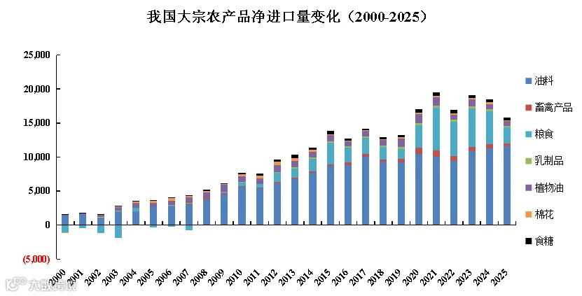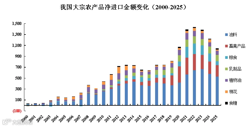 2025年我国大宗农产品净进口额为1,034.8亿美元,创2020年以来最低水平;同比降幅达14.9%,实现连续三年回调。