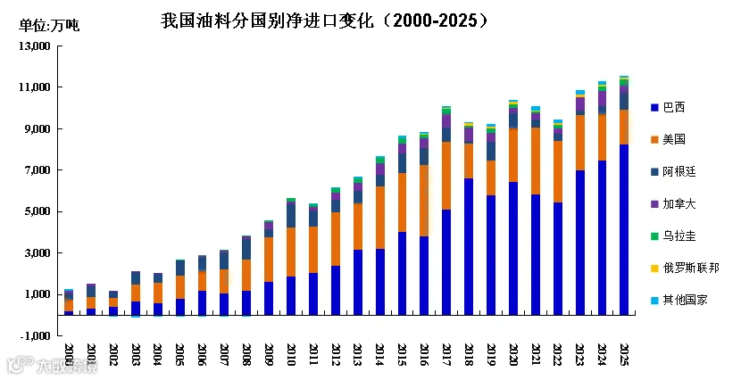 我国油料进口呈现显著的区域集聚特征,2025年前五大来源国合计占比达98.7%,较去年提升1.0个百分点。其中,巴西作为战略主供国地位进一步强化,净进口量达8,254.6万吨,占比71.5%,份额较去年提升5.4个百分点,连续四年实现对美进口替代。美国作为传统供应方净进口量降至1,683.9万吨,占比14.6%,份额同比收窄5.1个百分点。阿根廷以793.1万吨、占比6.9%,提升至第三大供应国;加拿大355.4万吨、占比3.1%,乌拉圭306.0万吨、占比2.7%,分列第四、第五位。受中美、中加贸易关税问题的影响,美国和加拿大供应能力均有所下降,这进一步促进我国在南美及澳洲油料产区的战略纵深拓展。