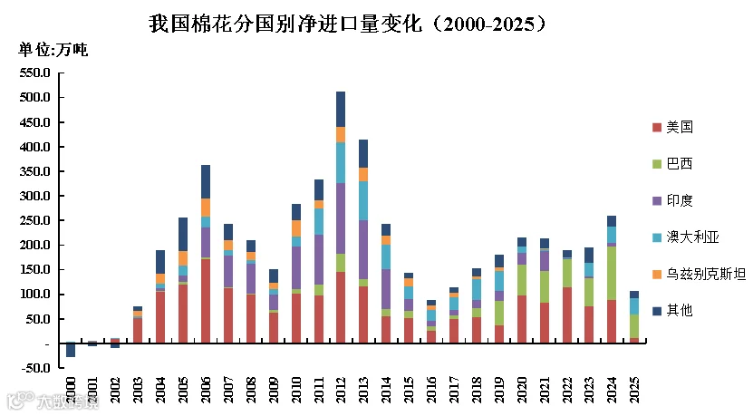 美国市场份额继续下降,巴西、澳大利亚替代势头迅猛:巴西以46.6万吨的进口量,占比43.9%,连续第二年位居首位;澳大利亚32.9万吨,占比31.0%,处于第二位。传统优势产棉国美国净进口量降至11.5万吨,占比仅10.9%。尤其是印度市场,其净进口量已断崖式下跌至0.7万吨,占比0.6%,基本退出主要供应国行列。
