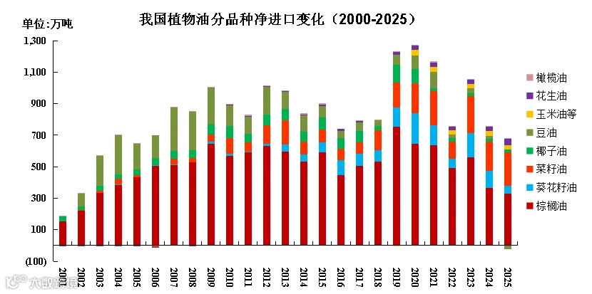 我国植物油净进口量连续两年下降,2025年总量减至655.6万吨,为近二十年来最低水平,同比降幅13.2%。豆油由净进口转为净出口,成为本轮国内油脂市场最突出特征,这一转变集中反映出国内大豆压榨产能持续过剩、消费增速放缓,叠加国际价差、贸易环境等多重因素,使得全年净出口量为21.6万吨(去年净进口量15.6万吨)。棕榈油净进口量为329.8万吨,同比减少9.7%,但市场份额仍居首位,为50.3%,同比提高2个百分点。菜籽油净进口量212.8万吨,同比增加24.7万吨,占比32.9%,仍为第二大进口品类;葵花籽油净进口量51.0万吨,同比大幅减少57.2万吨,占7.8%,为第三大品类。三大主力油种合计占比90.5%,较去年提高3.0个百分点。