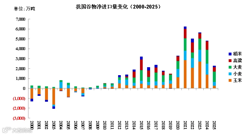 1、进口谷物结构深度调整:2025年净进口量同比大幅下降50.2%