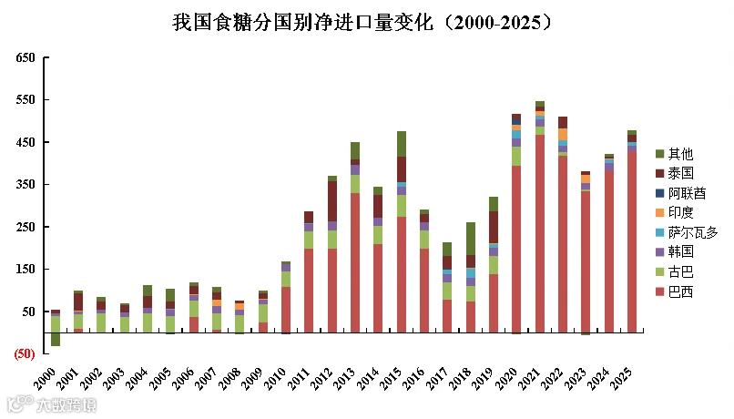 我国是食糖短缺国家,食糖净进口已成为常态,并几度达到500万吨以上的水平。2025年我国食糖净进口量为479.1万吨,增长13.7%。其中,巴西是最大的供应国,净进口量达到429.2万吨,占净进口总量的89.6%;其次是泰国和韩国,净进口量分别为16.6万吨和11.8万吨,占比分别为3.5%和2.5%。