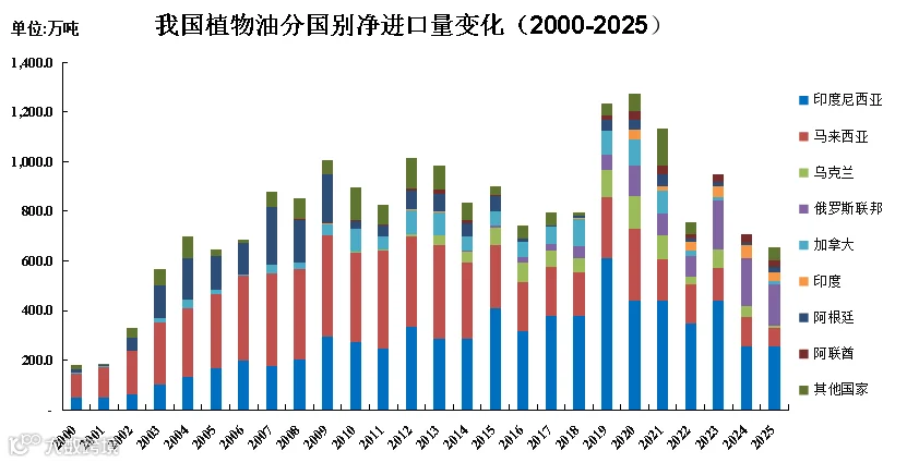 在全球贸易格局重构与地缘政治风险加剧的背景下,我国植物油进口来源持续向多元化、稳供应方向优化调整。2025年进口区域结构呈现东南亚继续收缩、东欧高位回落、来源更趋多元化的特征。印尼仍是我国植物油最大供应地,净进口量为255.9万吨,占比39.0%,下降8.8个百分点;自俄罗斯净进口165.8万吨,占比25.3%,下降10.9个百分点,位居第二位;自马来西亚净进口75.3万吨,占比11.5%,下降11.3个百分点,位居第三位。