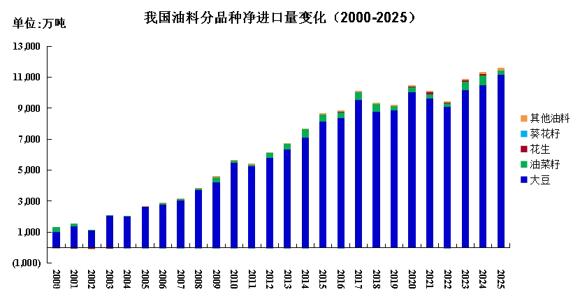 2025年我国油料净进口规模创历史新高,总量达1.15亿吨,同比增长2.2%。其中,大豆占据主导地位,进口量(系根据月度进口数据累加得出,与国家海关总署公布的最终数据有出入)连续三年突破亿吨大关,达1.12亿吨,占比96.8%,成为驱动进口增长的核心引擎。其他油料品种呈现差异化格局:油菜籽净进口250.3万吨,占比2.2%,维持第二地位;芝麻等特色油料净进口141.5万吨,占比1.2%,形成补充。