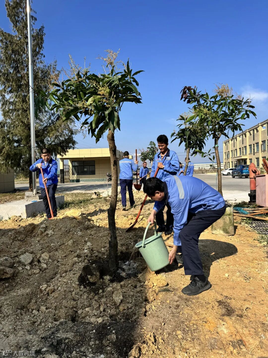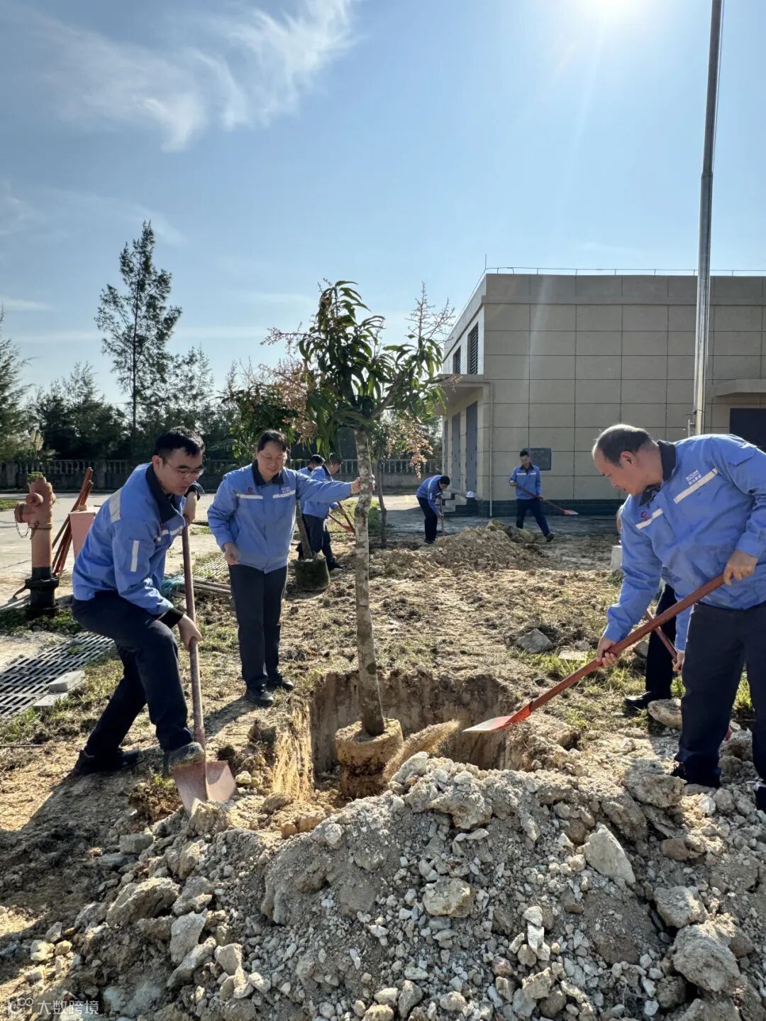 活动现场,公司中高层领导带头参与,大家分工协作,化身“果园园丁”。挥锹铲土、扶苗填坑、提水浇灌,各个环节衔接有序,配合默契。