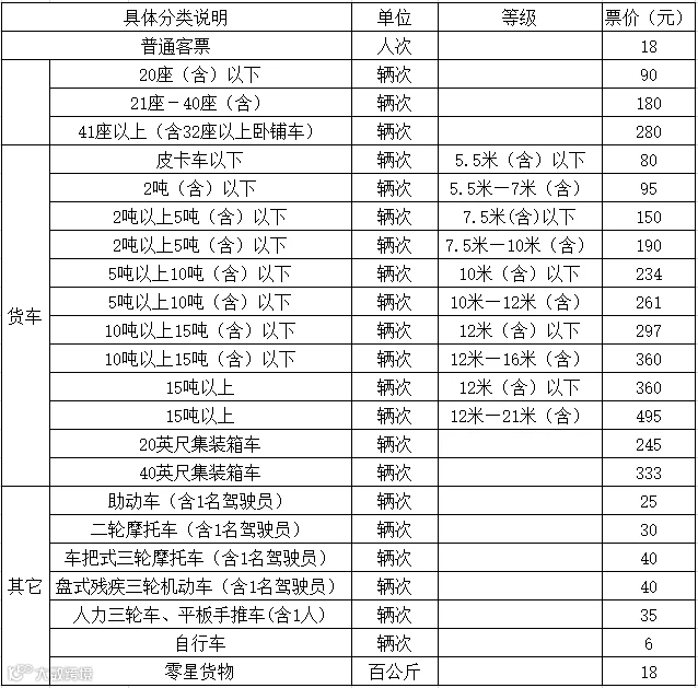 鸭蛋山—白峰轮渡收费标准