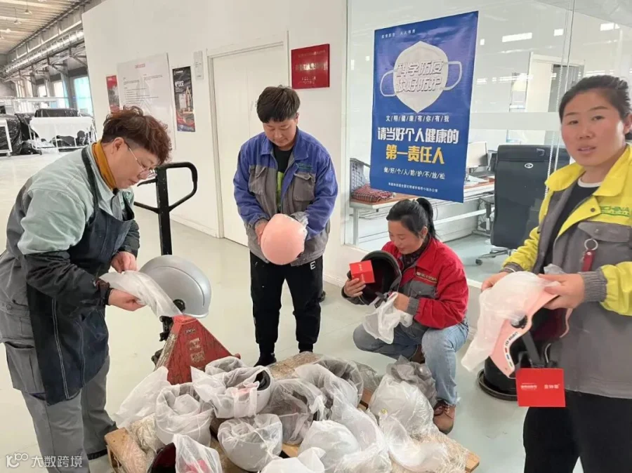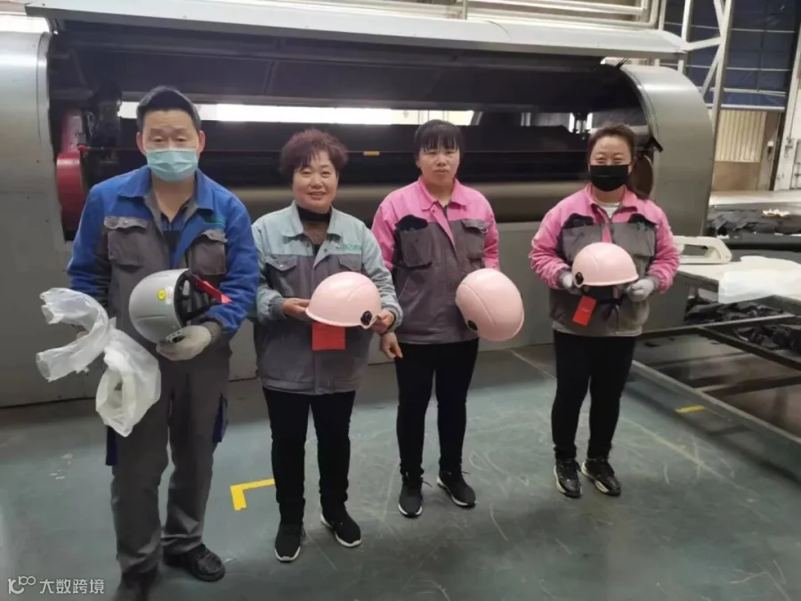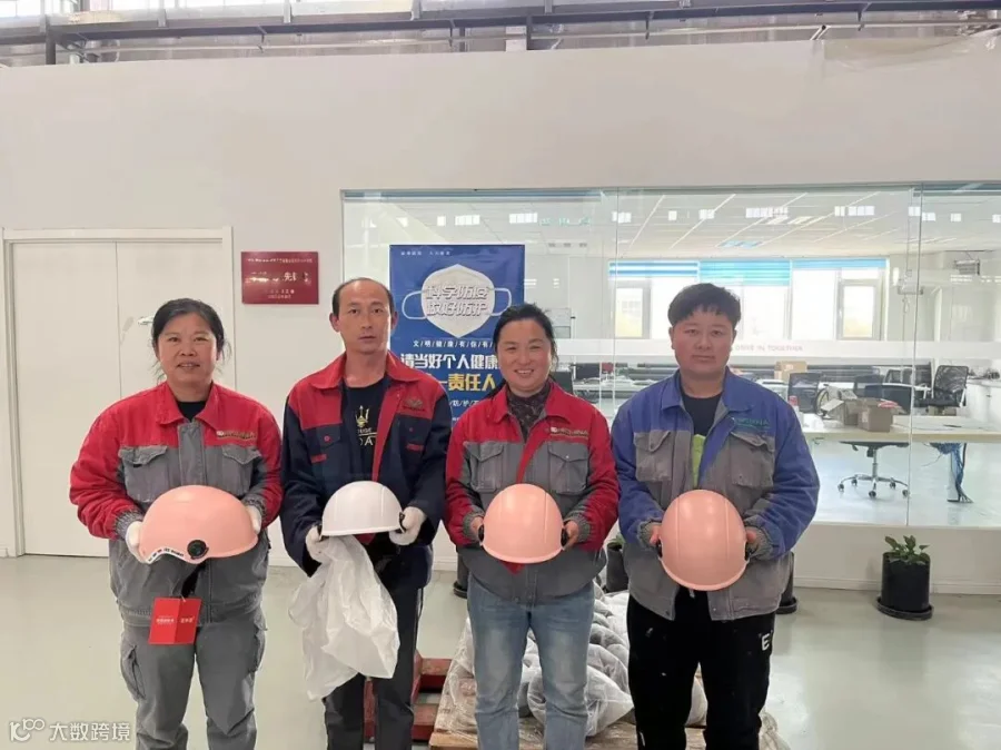 “咱们的车有了正式车牌了,工会贴心送头盔,以后上道路骑行更要遵守交通规则,特别是要佩戴安全头盔。”