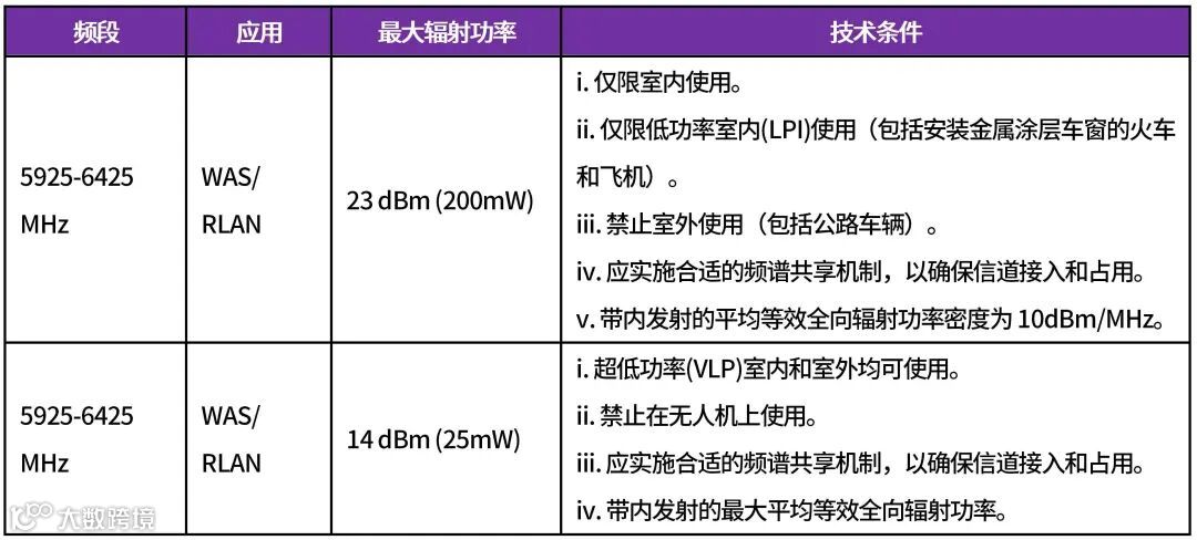 根据该提案草案,NCA授权将5925-6425 MHz (L6GHz)频段用于无线接入系统/无线局域网,初步制定的技术和操作条件如下: