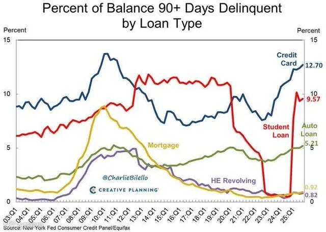 The landscape for consumer loans is also deteriorating, with delinquencies against student debt, auto loans, and credit card payments all moving significantly higher in recent quarters.