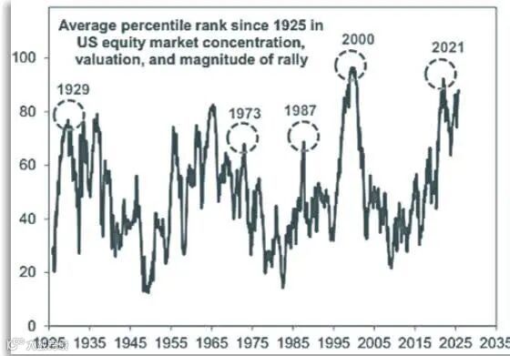 Average percentile rank since 1925 in US equity market concentration, valuation, and magnitude of rally
