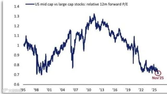 US mid cap vs large cap stocks: relative 12m forward P/E
