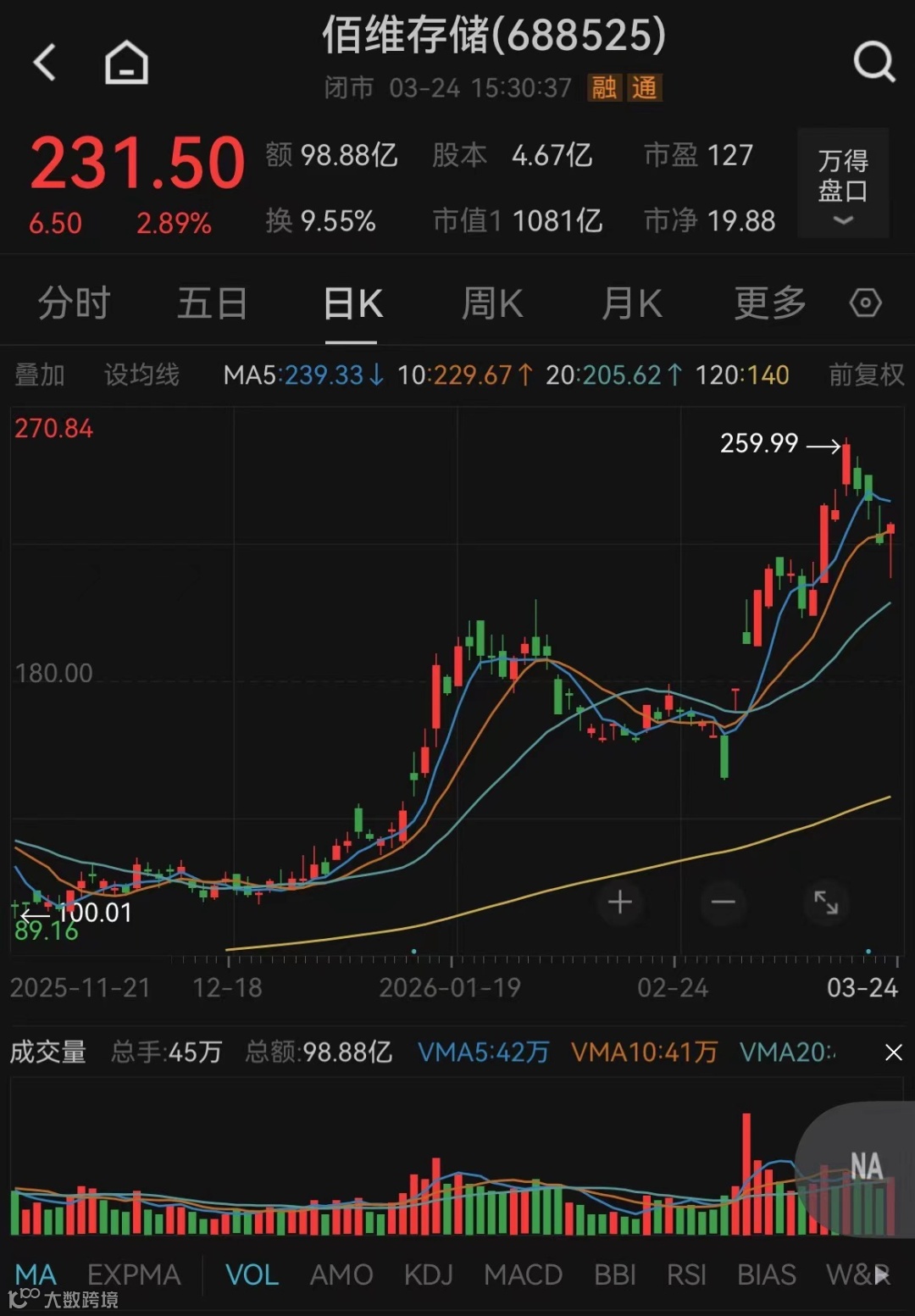 Wind数据显示,3月24日,佰维存储收报231.5元/股,总市值为1081亿元。今年以来,佰维存储股价累计上涨101.67%。
