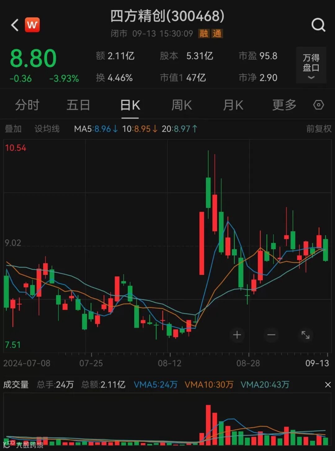 Wind数据显示,截至9月13日收盘,公司股价报8.8元/股,市值47亿元。