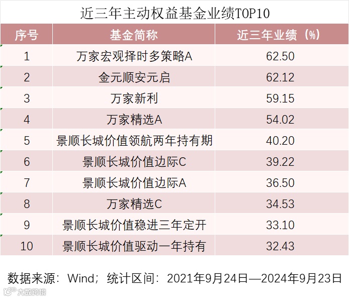 将时间拉长至三年,截至9月23日,近三年来主动权益基金中表现最好的是万家基金黄海管理的万家宏观择时多策略A,近三年累计收益率达62.50%;金元顺安基金缪玮彬管理的金元顺安元启近三年累计收益率为62.12%,这两只基金也是近三年来仅有的两只收益率超60%的基金。万家新利、万家精选A、景顺长城价值领航两年持有期近三年的收益均超过40%。