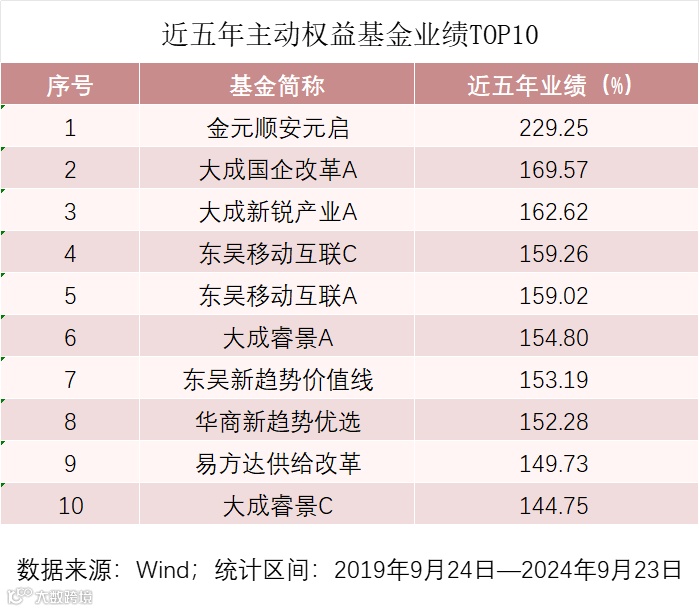 从五年期业绩来看,Wind数据显示,金元顺安元启是唯一一只近五年收益率超200%的基金;大成国企改革A、大成新锐产业A、东吴移动互联、大成睿景A、东吴新趋势价值线、华商新趋势优选等基金近五年收益率均超过150%;易方达供给改革、交银趋势优先A、创金合信资源主题A近五年收益率也超过100%。