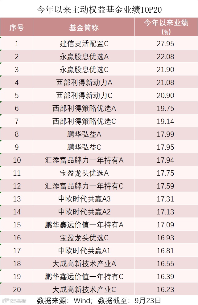 第三季度即将结束,2024年前三季度基金业绩也将揭晓。截至9月23日(下同),在主动权益类基金中,建信基金叶乐天、郭志腾管理的建信灵活配置C、永赢基金许拓管理的永赢股息优选A、永赢股息优选C以及西部利得基金何奇管理的西部利得新动力A和西部利得新动力C是仅有的五只收益率超过20%的基金。