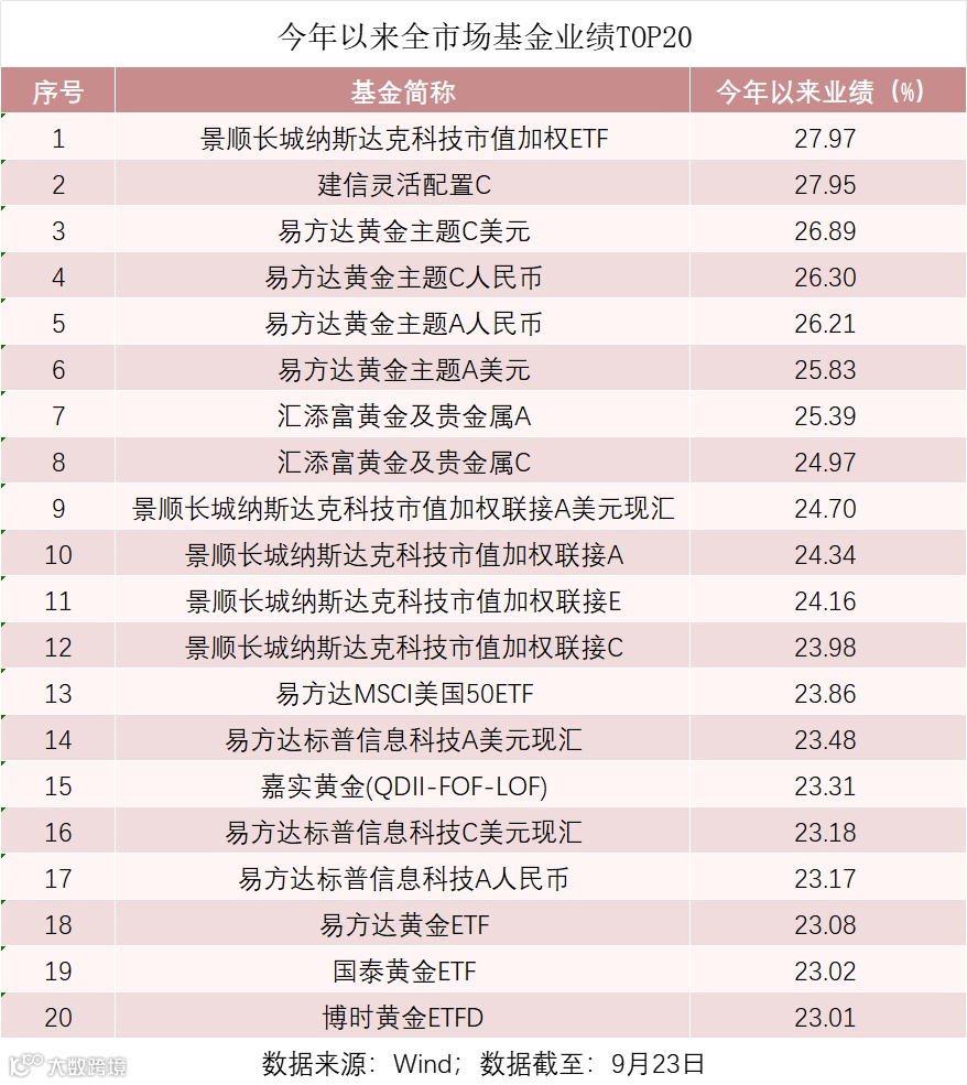 截至9月23日,今年以来,在全市场所有基金中,收益率排名靠前的主要是QDII和黄金主题基金。