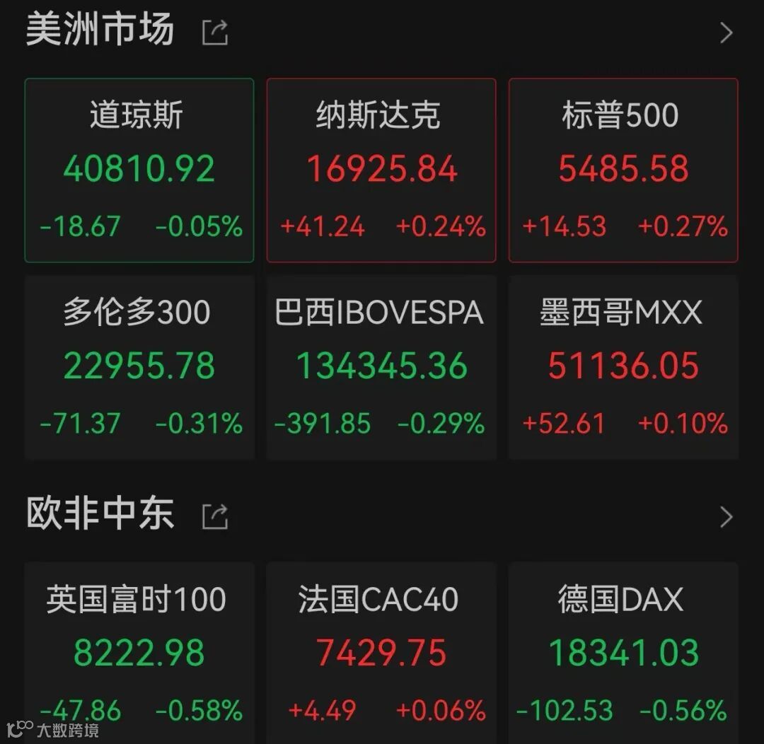 从欧美股市今夜整体表现看,美股三大股指盘初集体高开,此后走势分化,截至北京时间9月10日21:40,道指微跌0.05%,纳指、标普500指数分别上涨0.24%、0.27%;欧股方面,英国富时100指数、法国CAC40指数、德国DAX指数涨跌不一。