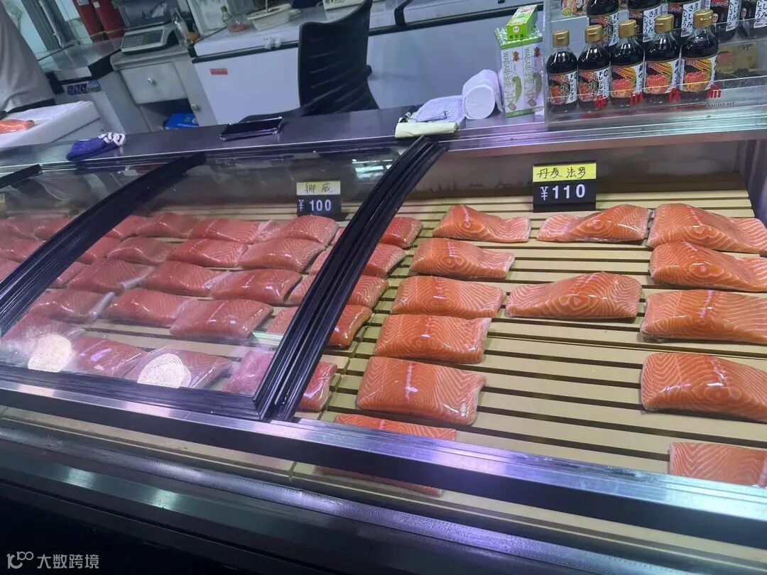 记者在海鲜批发市场看到,国产三文鱼目前价格为50元/斤,挪威三文鱼价格为100元/斤,丹麦三文鱼价格为110元/斤。