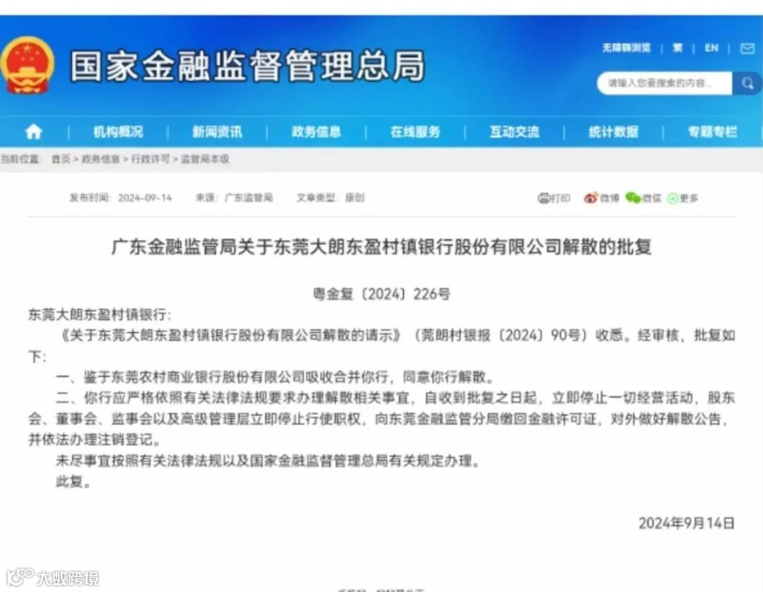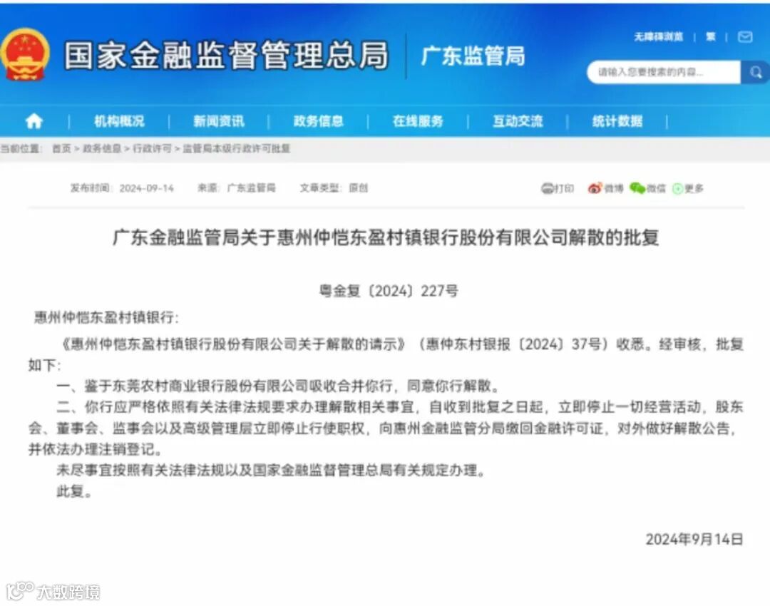 9月14日,金融监管总局网站披露公开两则批复,同意东莞大朗东盈村镇银行、惠州仲恺东盈村镇银行因被东莞农村商业银行吸收合并而解散。