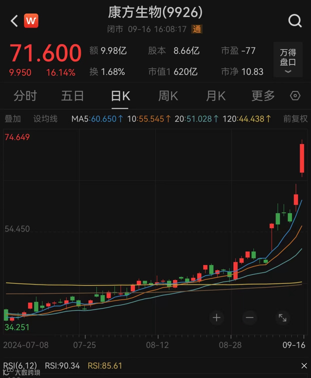 康方生物上涨16.14%,收盘报71.60港元/股,创收盘历史新高,成交额为9.98亿港元,市值为620亿港元。9月以来,康方生物累计上涨46.64%,走势大幅强于大盘。