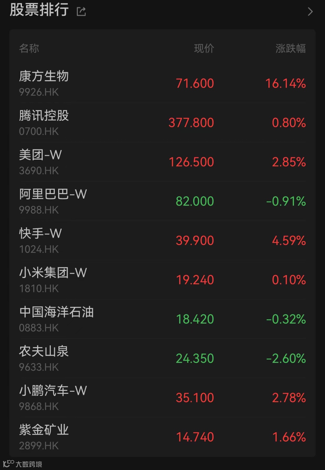 焦点股中,腾讯控股上涨0.80%,早盘一度跌逾1%;阿里巴巴-SW下跌0.91%,早盘一度跌逾1%;美团-W上涨2.85%。三只股票成交额分别为28.89亿港元、21.73亿港元、26.84亿港元,成交额为港股市场第一、第三、第二位。此外,快手-W涨逾4%,蔚来-SW涨近4%,小鹏汽车-W涨近3%。