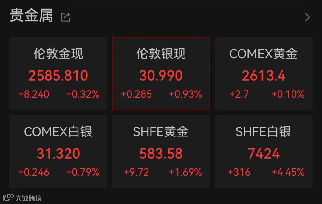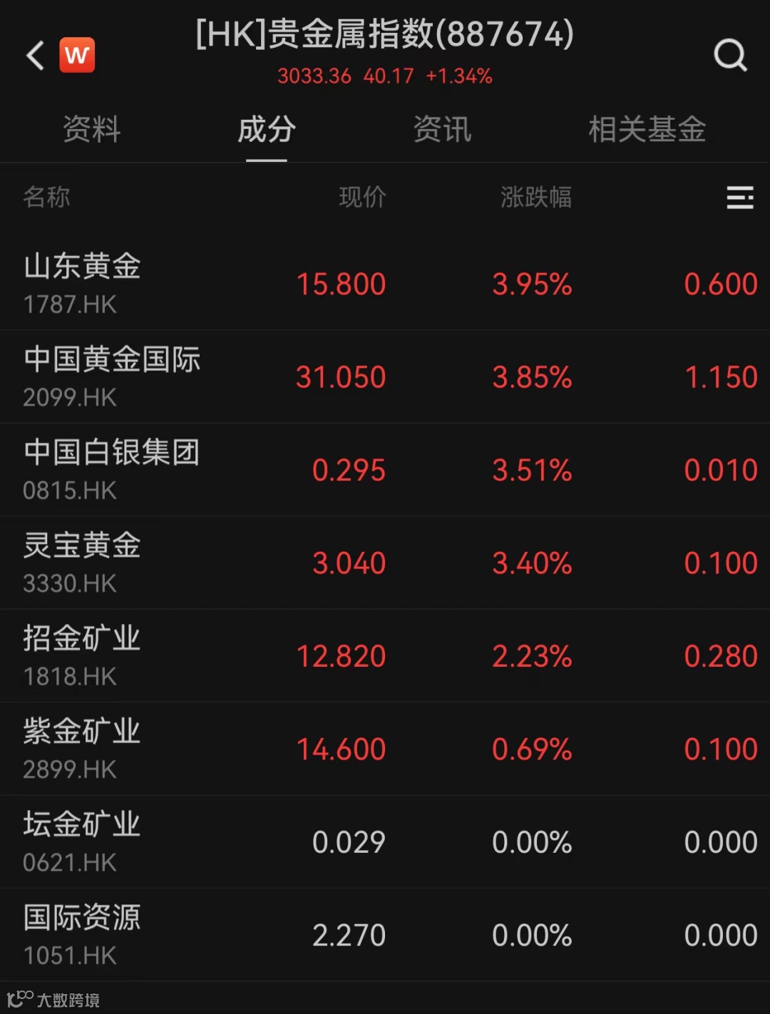 港股贵金属板块走强,山东黄金、中国黄金国际、中国白银集团、灵宝黄金均涨逾3%。
