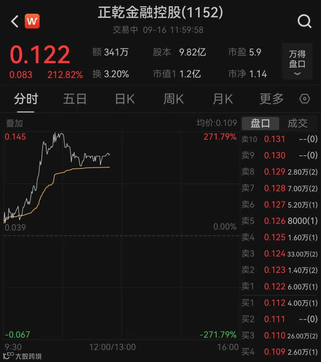 正乾金融控股为16日早盘港股市场涨幅最大的个股,盘中一度涨逾270%,早盘成交额为341万港元,市值为1.2亿港元。
