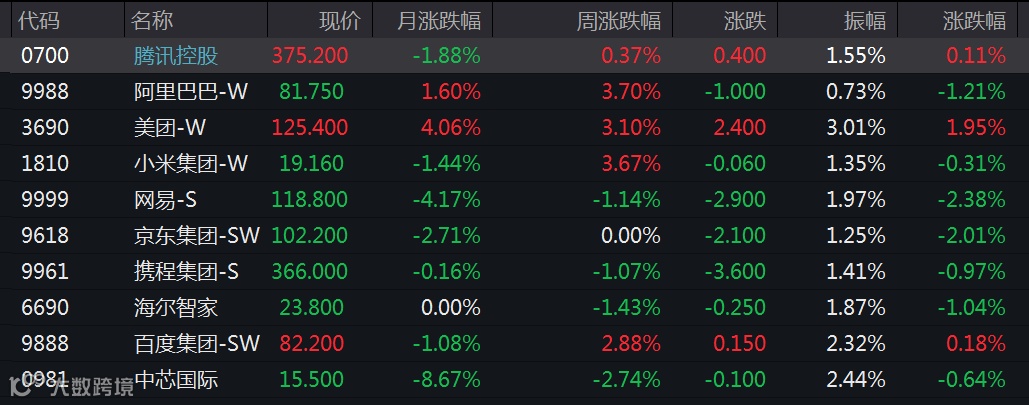 腾讯控股上涨0.11%,早盘一度跌逾1%;阿里巴巴-SW下跌1.21%;美团-W涨近2%。这三只股票早盘成交额分别为11.72亿港元、11.07亿港元、12.15亿港元,其中美团-W、腾讯控股成交额分列港股市场第一、第二位。