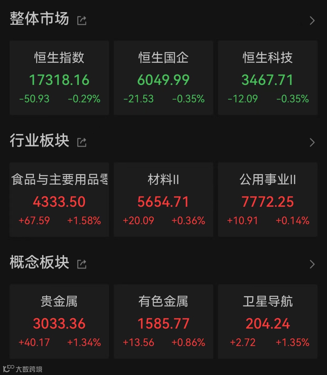 9月16日,早盘香港恒生指数、恒生科技指数均一度跌逾1%。截至午间收盘,香港恒生指数下跌0.29%,恒生中国企业指数下跌0.35%,恒生科技指数下跌0.35%。国际黄金价格再创历史新高,伦敦现货黄金盘中一度报2589美元/盎司。