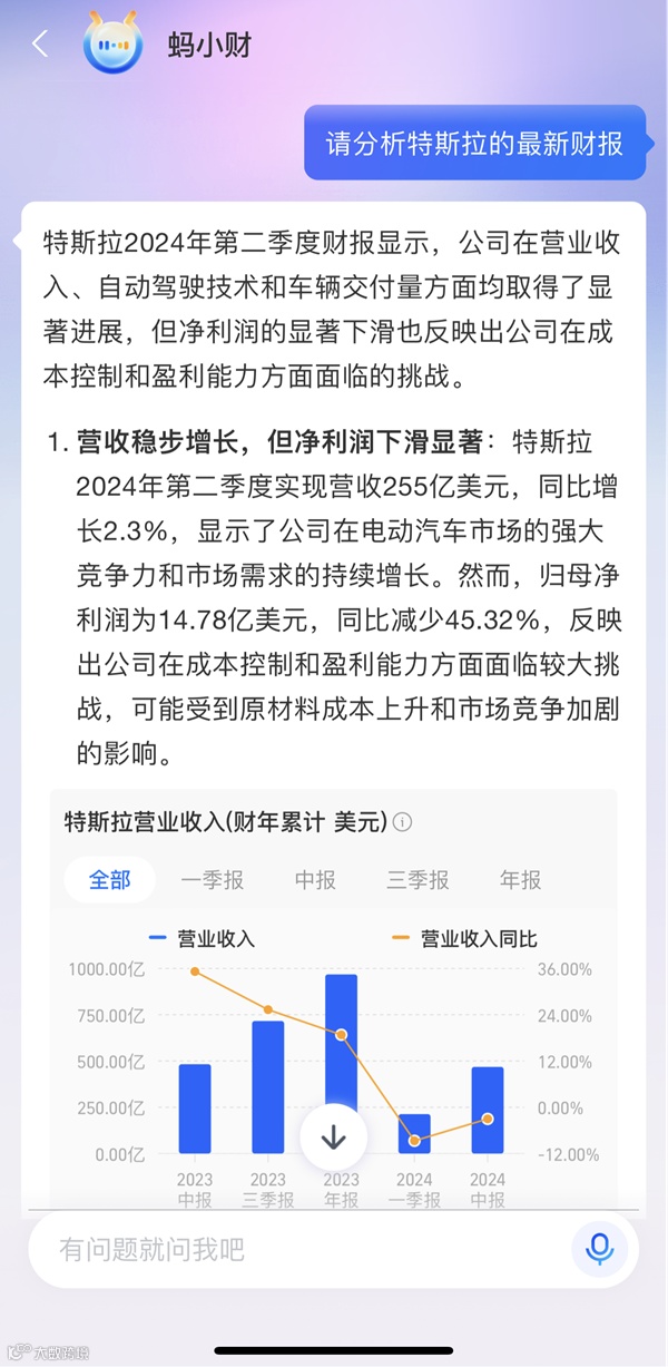 同时,“蚂小财”还能迅速对上市公司财报进行解读,不仅能即刻生成图文版财报解读,还能清晰呈现营收等核心数据的变化和原因。