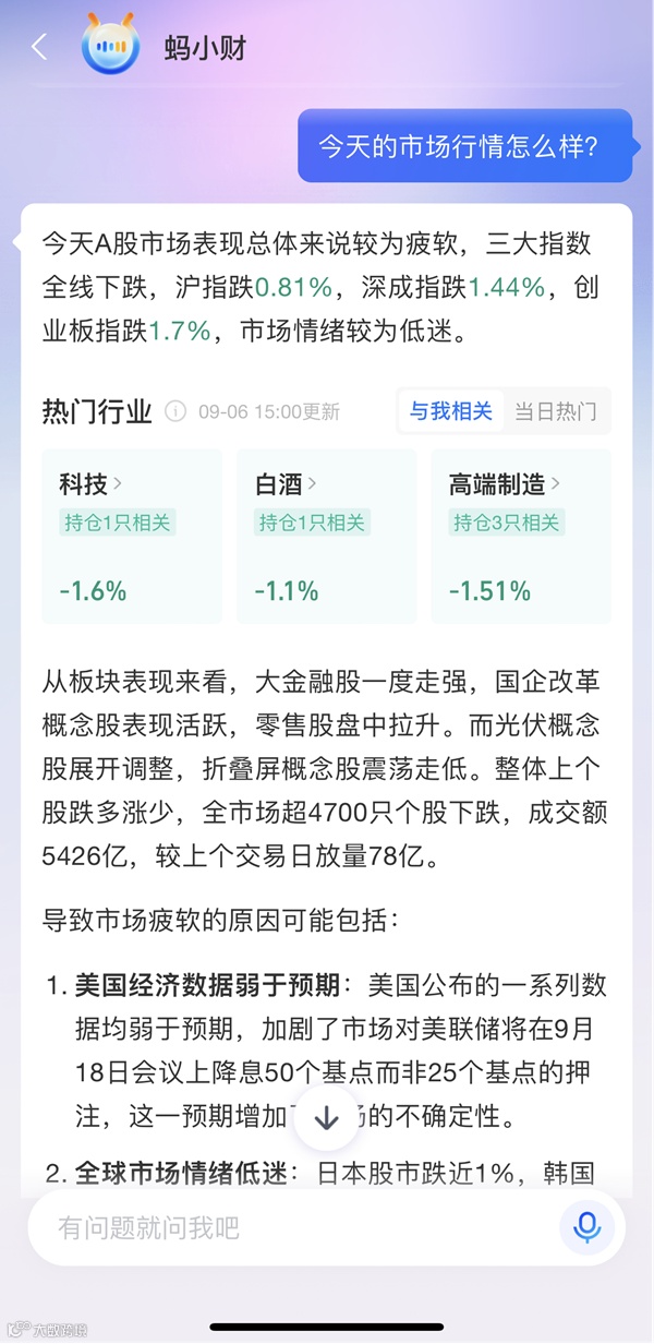 例如,在被问及今天的市场行情时,“蚂小财”可以迅速分析今日股市涨跌、板块表现并对后市进行展望。