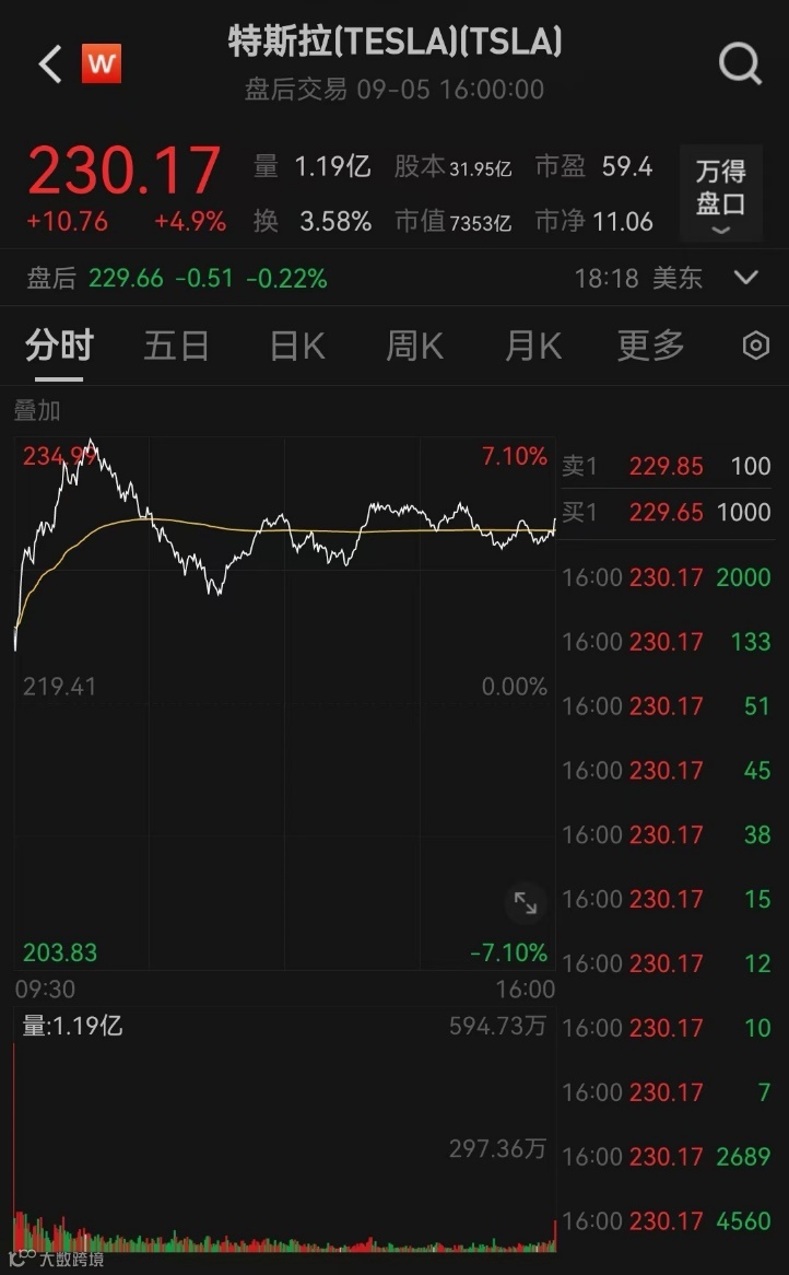 当地时间9月5日,特斯拉股价早盘曾涨至约235美元,最高涨幅达7.1%,刷新7月23日以来盘中高位;收涨4.9%,创8月以来收盘新高。周三和周四两日累计反弹约9.3%。