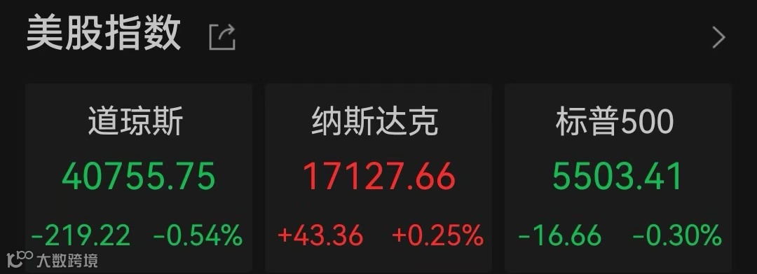 当地时间9月5日,美股三大股指收盘涨跌不一,截至收盘,道指跌0.54%报40755.75点,标普500指数跌0.30%报5503.41点,纳指涨0.25%报17127.66点。