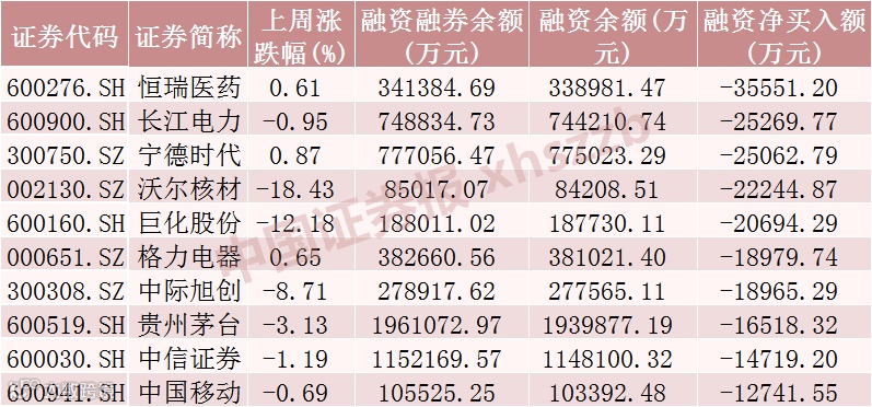 时代、沃尔核材、巨化股份、格力电器、中际旭创、贵州茅台、中信证券、中国移动,分别净卖出3.56亿元、2.53亿元、2.51亿元、2.22亿元、2.07亿元、1.90亿元、1.90亿元、1.65亿元、1.47亿元、1.27亿元。从市场表现上来看,这10只股票上周跌多涨少,涨幅最大的宁德时代涨近1%,跌幅最大的沃尔核材跌逾18%。