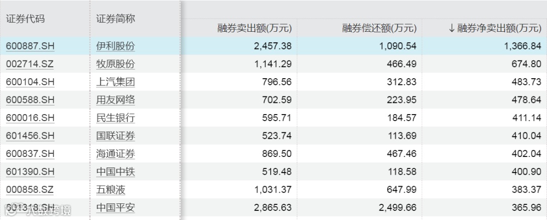 上周融券净卖出额居前的股票为伊利股份、牧原股份、上汽集团,分别为1366.84万元、674.80万元、483.73万元。