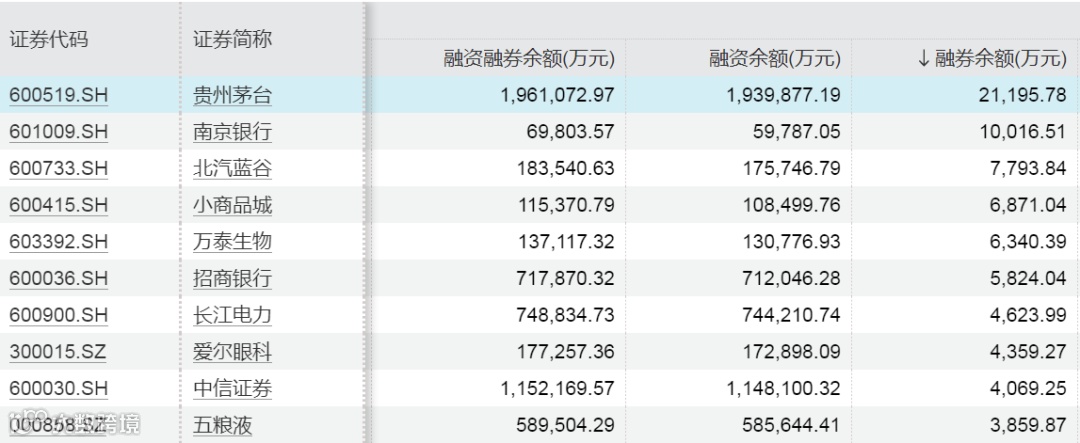 Wind数据显示,截至9月6日,A股市场融券余额居前的股票分别为贵州茅台、
