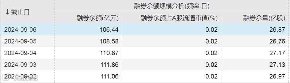 Wind数据显示,截至9月6日,A股市场融券余额为106.44亿元,创逾4年新低,上周融券余额减少7.51亿元,融券余量为26.87亿股。今年以来,A股市场融券余额从715.97亿元下降至106.44亿元,降幅超过85%。