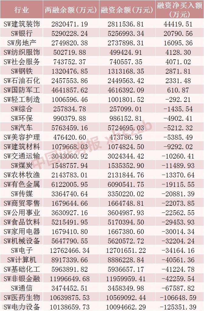 融资客加仓建筑装饰行业超4亿元