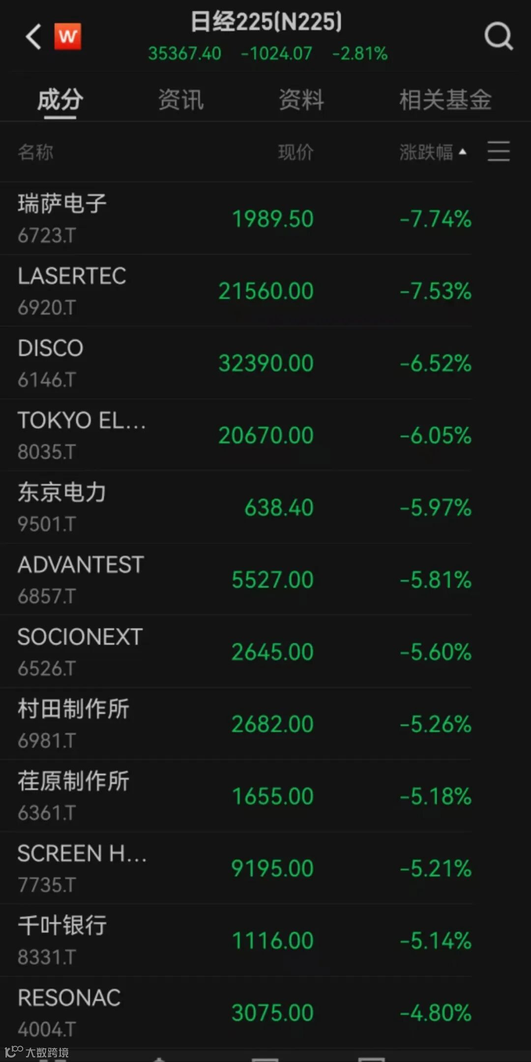 电力跌近6%,三越伊势丹、野村控股、安川电机均跌逾4%。