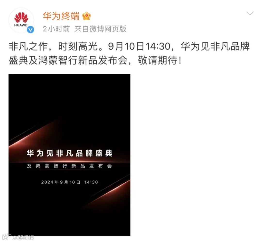 华为将于9月10日14:30举办华为见非凡品牌盛典及鸿蒙智行新品发布会。