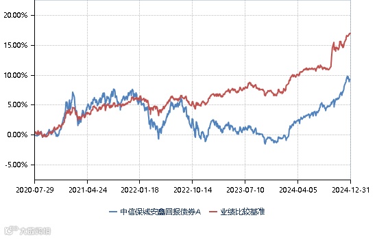 中信保诚安鑫回报债券成立于2020年7月29日,业绩比较基准为中债综合财富(总值)指数收益率*80%+沪深300指数收益率*15%+金融机构人民币活期存款基准利率(税后)*5%。历史业绩/基准业绩: