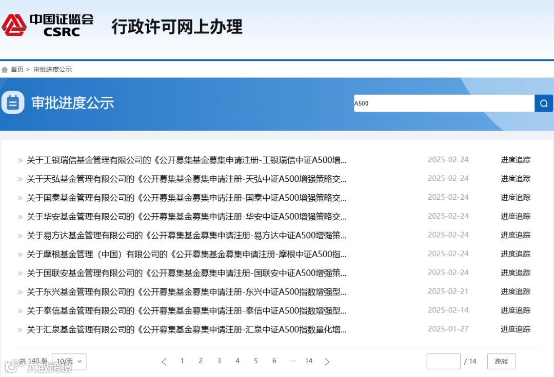 根据证监会网站披露的数据,截至2月24日,跟踪中证A500指数的相关公募产品上报数量已达140只,其中指数增强型基金居多,此前上报的场外指数增强基金加上此次上报的增强策略ETF合计数量已超过60只。