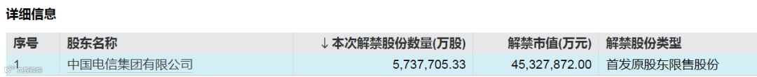 中国电信将解禁市值超4500亿元