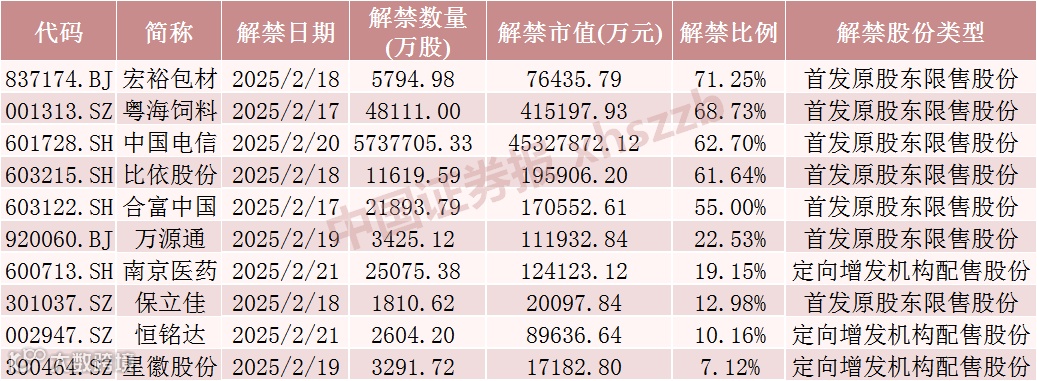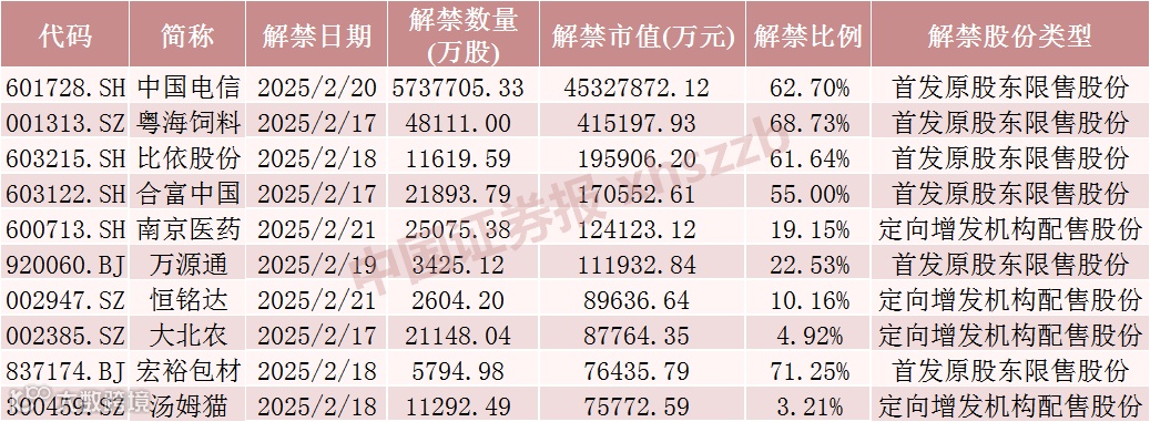具体来看,Wind数据显示,中国电信2月20日将解禁573.77亿股,均为首发原股东限售股份。粤海饲料2月17日将解禁4.81亿股,均为首发原股东限售股份。比依股份2月18日将解禁1.16亿股,均为首发原股东限售股份。