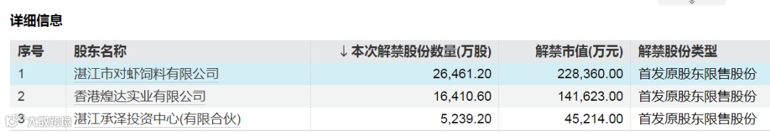 解禁市值第二大的粤海饲料解禁股东为