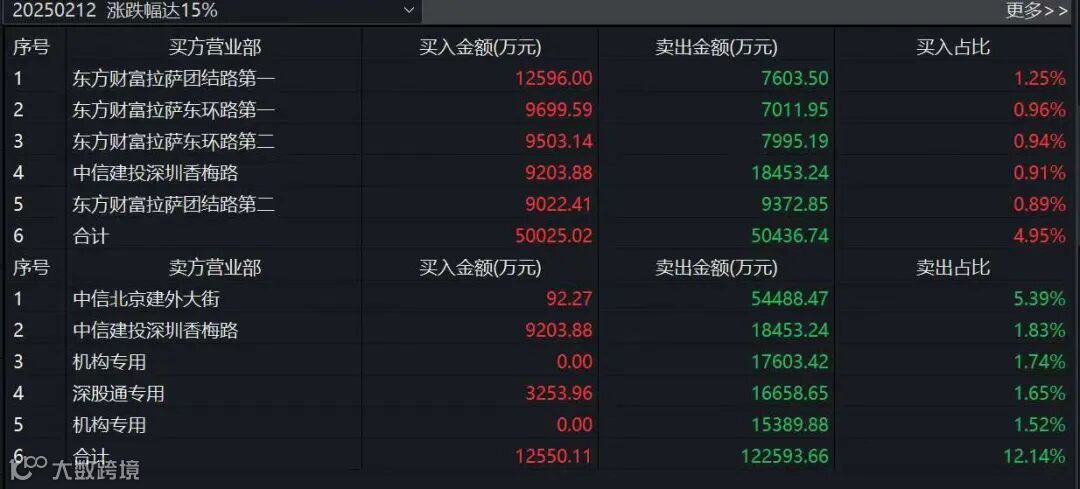 龙虎榜数据显示,买方前五席位中,有4个席位是东方财富证券股份有限公司的营业部。买一席位为东方财富证券股份有限公司拉萨团结路第一证券营业部,当天买入1.26亿元,卖出7603.5万元,净买入4992.5万元。
