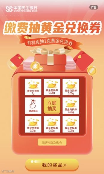 不仅是支付宝,记者注意到部分银行也推出类似缴费抽取黄金兑换券等活动,以吸引增量客户,维系存量客户。例如,民生银行针对缴费新客,推出缴费满30元领黄金兑换券活动。针对缴费存量客户,推出缴费满50元抽黄金兑换券活动。
