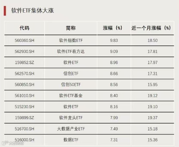 截至收盘,软件指数ETF、软件ETF易方达涨超9%,信创ETF、信创50ETF等涨超8%。
