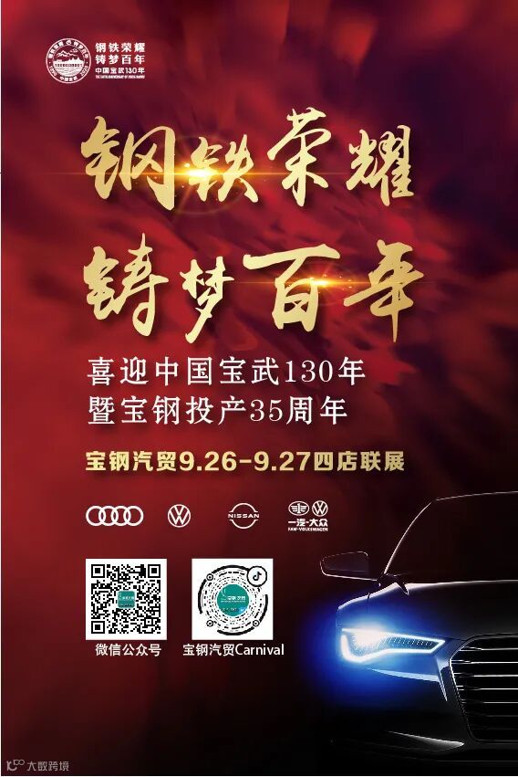 宝钢汽贸过去的成长离不开您的青睐和信赖,未来的发展更需要您的帮助和支持。特在此邀请您于9.26-27日拨冗莅临宝钢汽贸四店联展嘉年华活动现场(宝乐汇中庭),我们已为您准备好丰富多样的节目和伴手礼。如蒙应允、不胜欣喜。